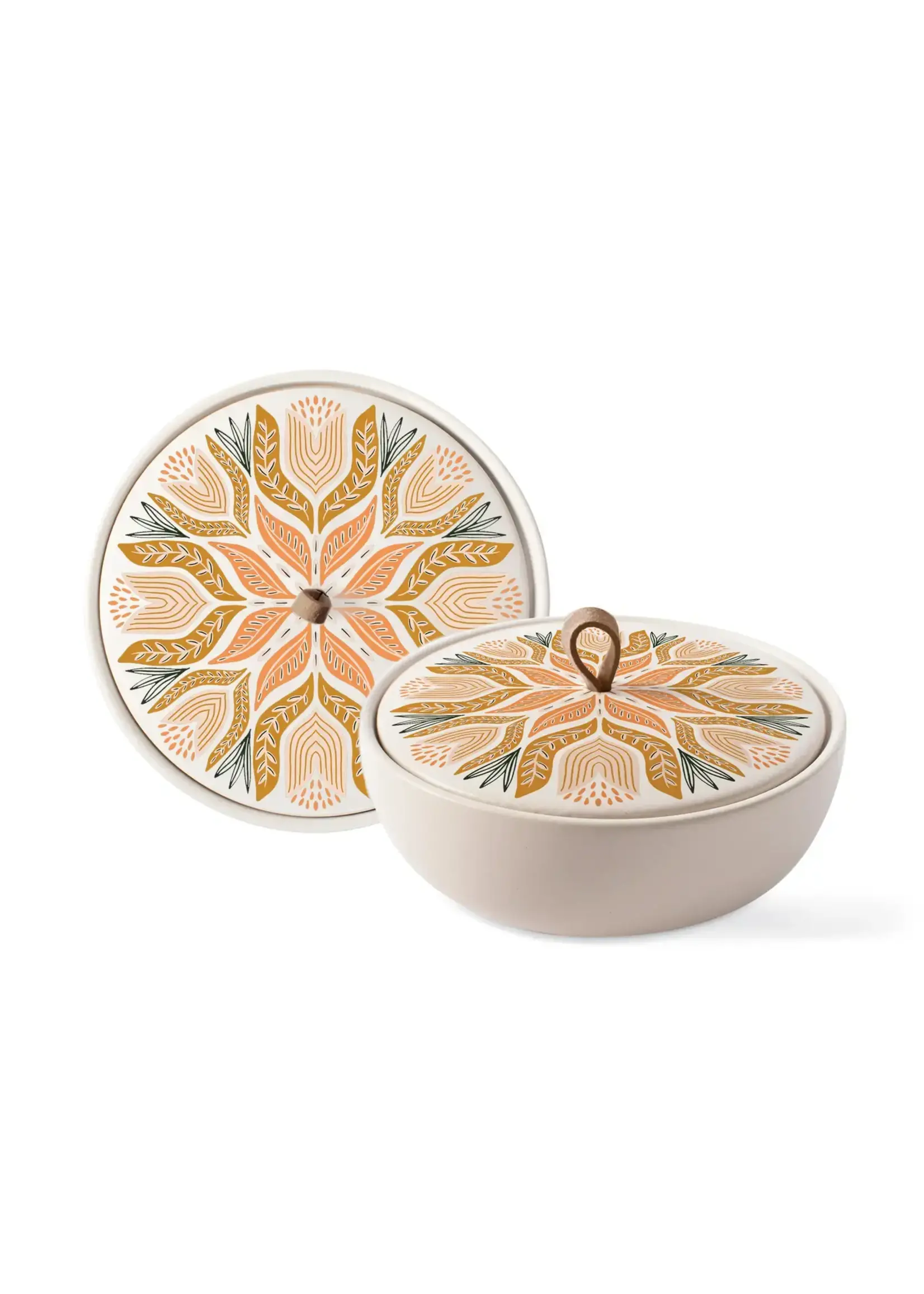Exposed stoneware base with matte color glaze with decal art. For decorative use only. Featuring artwork by Juliana Tipton.
